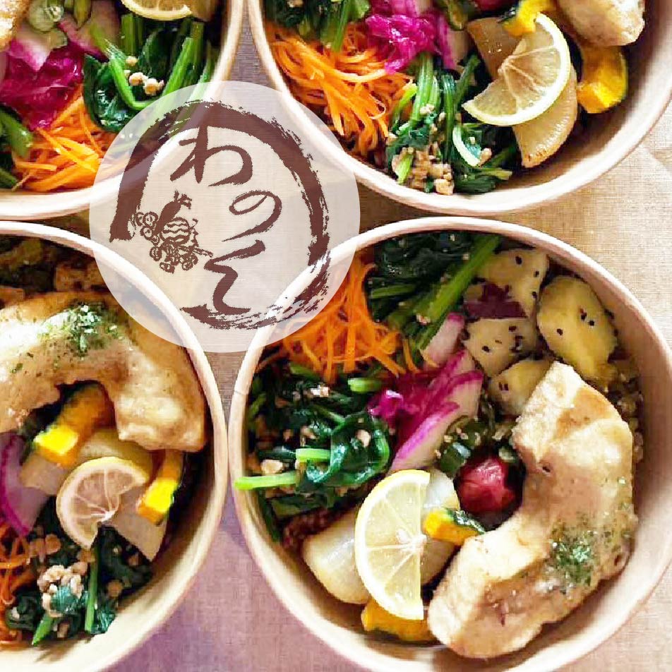無農薬の自家栽培の玄米を発酵させた酵素玄米に無農薬米の白米も合わせ、野菜のおかず5~6種類とチキンの玄米糀漬けオーブン焼きを合わせたボリューム満点の一品です