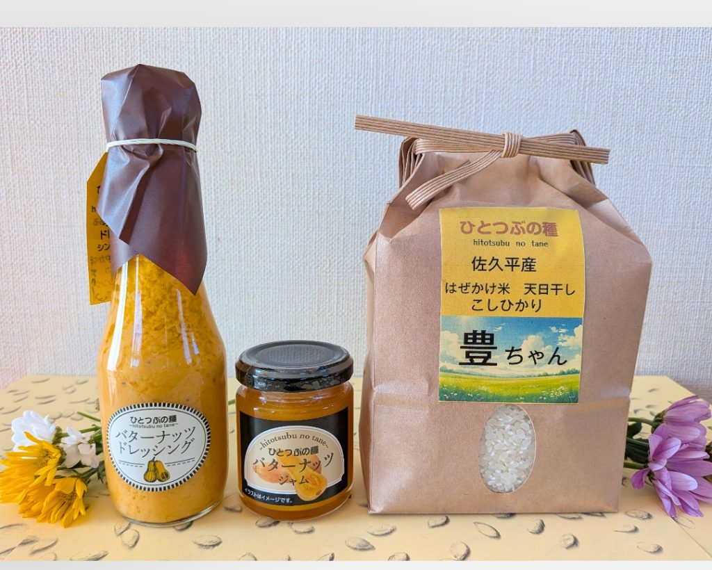 地元育ち濃厚バターナッツ(カボチャの一種)のジャム・ドレッシングと旨味たっぷりの低温精米のお米を提供していらっしゃる、ひとつぶの種~hitotsubu no tane~さん