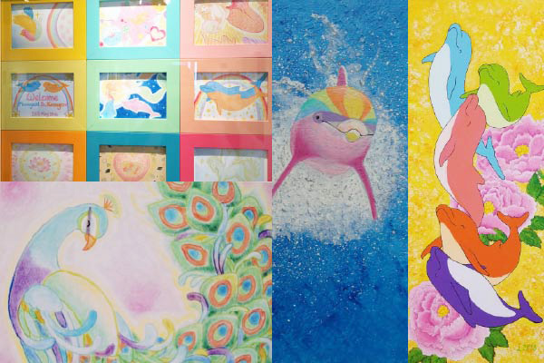パステル、アクリル、水彩など多彩な画材で描く作品は、イルカを思わせる愛・調和・喜び・自由さがあふれています